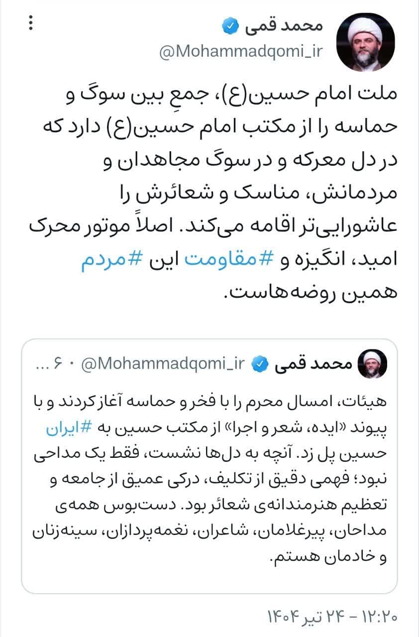 به گزارش روابط عمومی سازمان تبلیغات اسلامی، حجتالاسلام محمد قمی، رئیس سازمان تبلیغات اسلامی در صفحه شخصی خود در شبکه ویراستی در پاسداشت عزاداریهای حماسی و زحمات هیئات حسینی در سراسر ایران نوشت؛