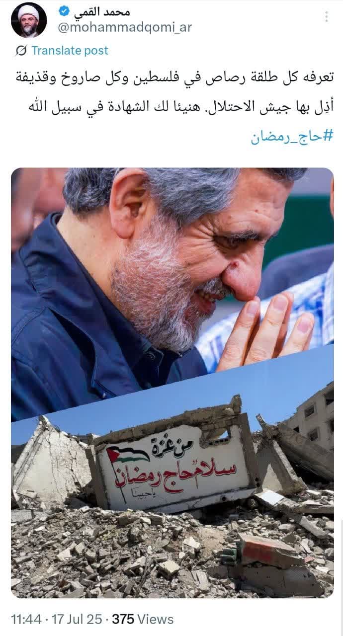 به گزارش روابط عمومی سازمان تبلیغات اسلامی، حجت‌الاسلام محمد قمی، با اشاره به شهادت سردار محمدسعید ایزدی (حاج رمضان) در صفحه شخصی خود در شبکه ایکس ویژه مخاطبان عرب زبان نوشت؛