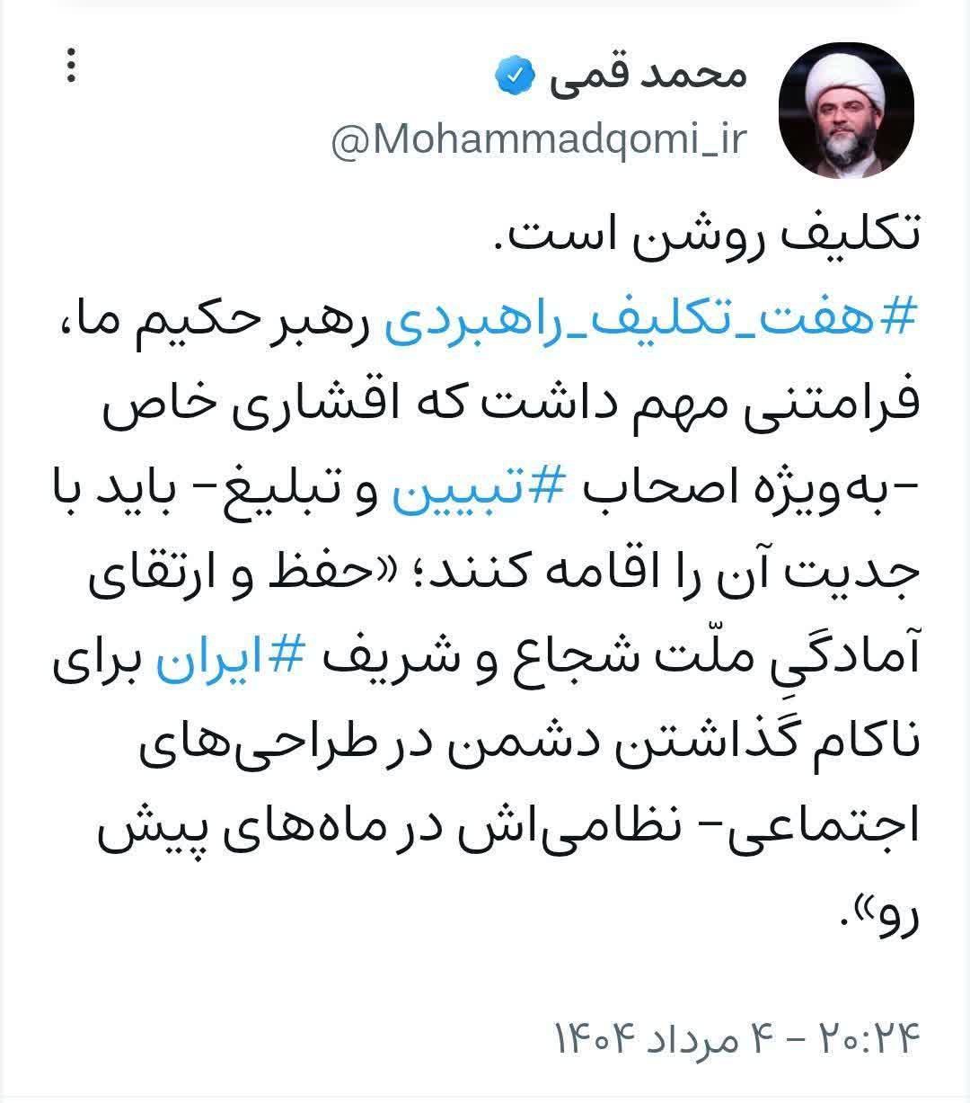 به گزارش روابط عمومی سازمان تبلیغات اسلامی، حجت‌الاسلام محمد قمی، در صفحه شخصی خود در شبکه ویراستی با اشاره به پیام رهبر انقلاب در چهلمین روز شهادت سرداران و دانشمندان کشورمان نوشت؛
