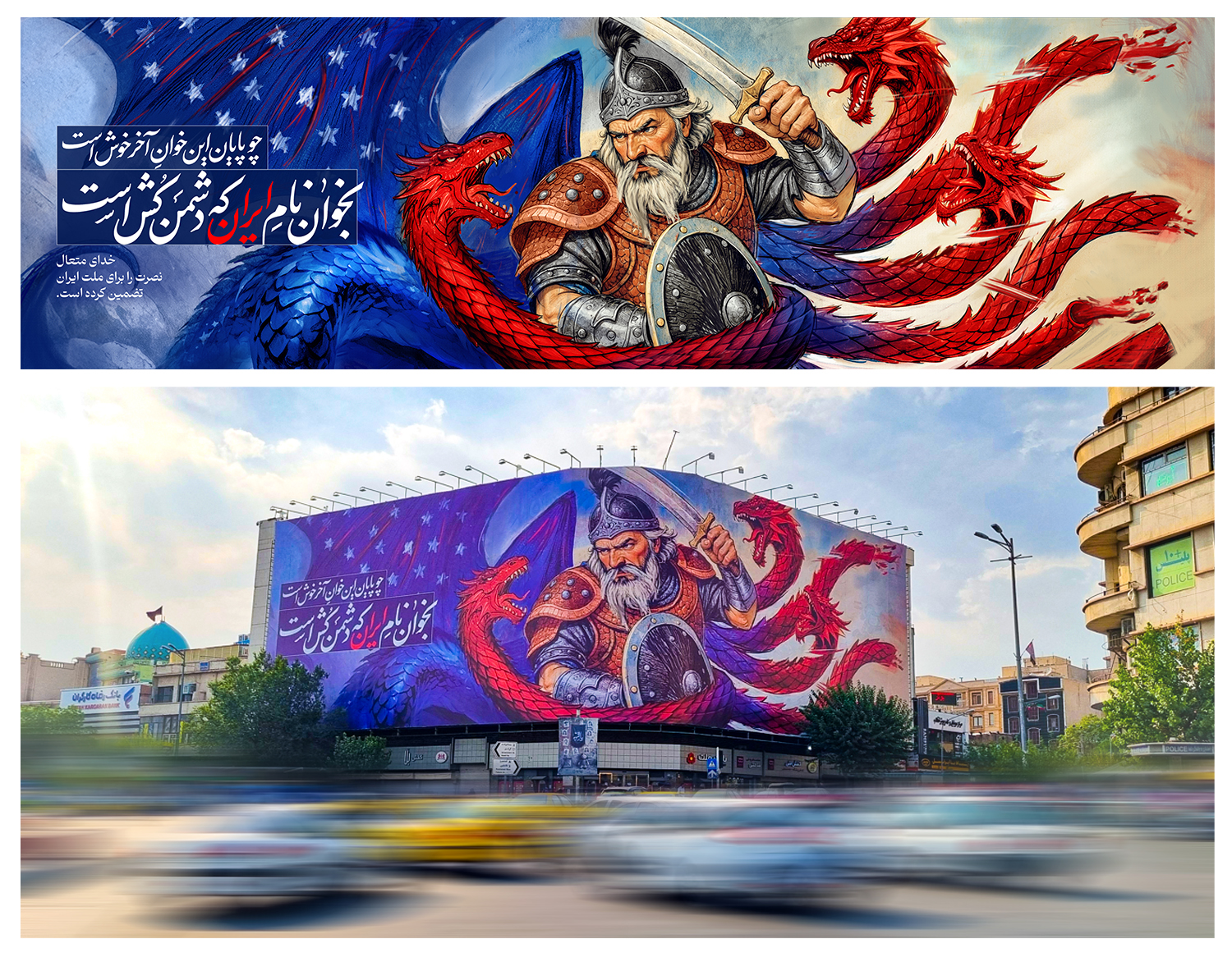 به گزارش روابط عمومی سازمان تبلیغات اسلامی، جدیدترین دیوارنگاره میدان انقلاب تهران صبح امروز هفتم مرداد ماه با طرحی از نبرد رستم با اژدهای آمریکا و با شعار «بخوان نام ایران که دشمن کش است» رونمایی شد.
