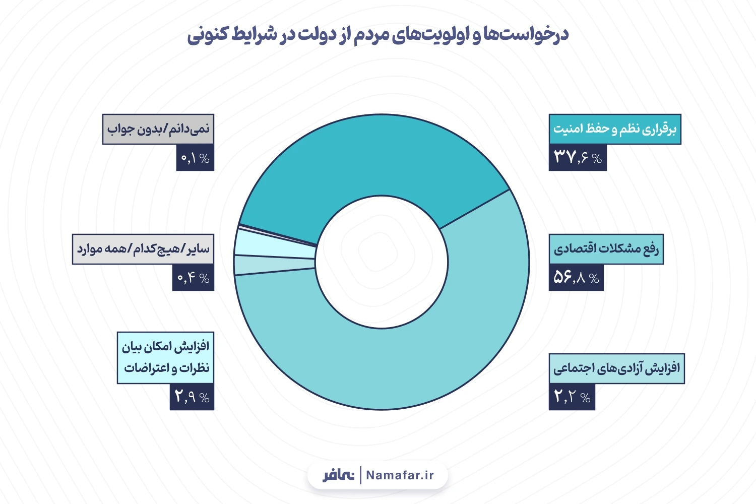 شناسایی و بررسی اولویتها و درخواستهای مردم و جامعه از دولت یکی دیگر از سؤالاتی بوده که از پاسخگویان سؤال شده است. رفع مشکلات اقتصادی مثل بیکاری، تورم و مسکن با 56.8درصد، همچنان اولویت و درخواست اصلی مردم از دولت بوده است. با این حال، برقراری نظم و حفظ امنیت در تمام شهرها و مرزهای کشور، نیز با 37.6درصد، جایگاه ویژهای در درخواستهای مردم پیدا کرده است.