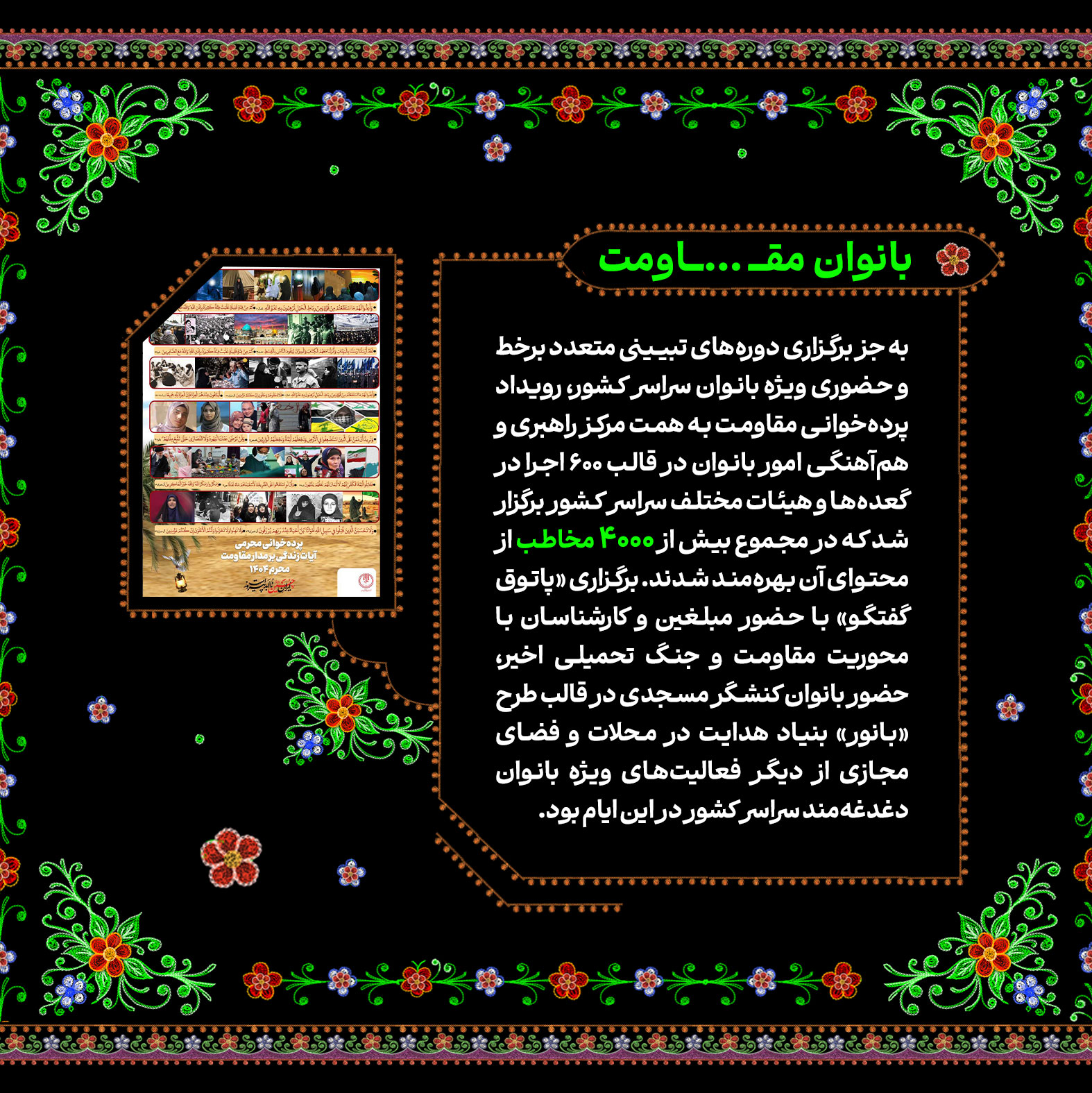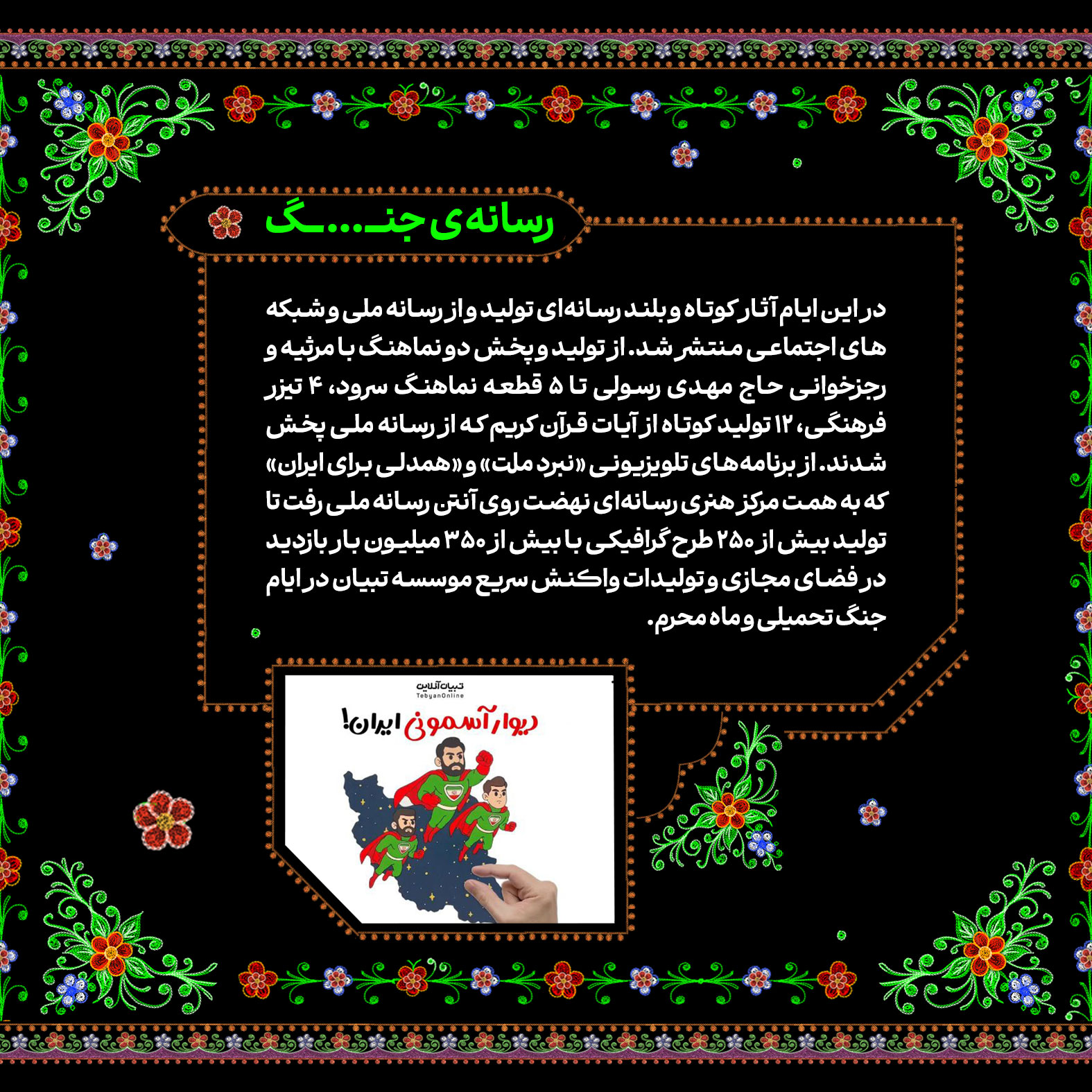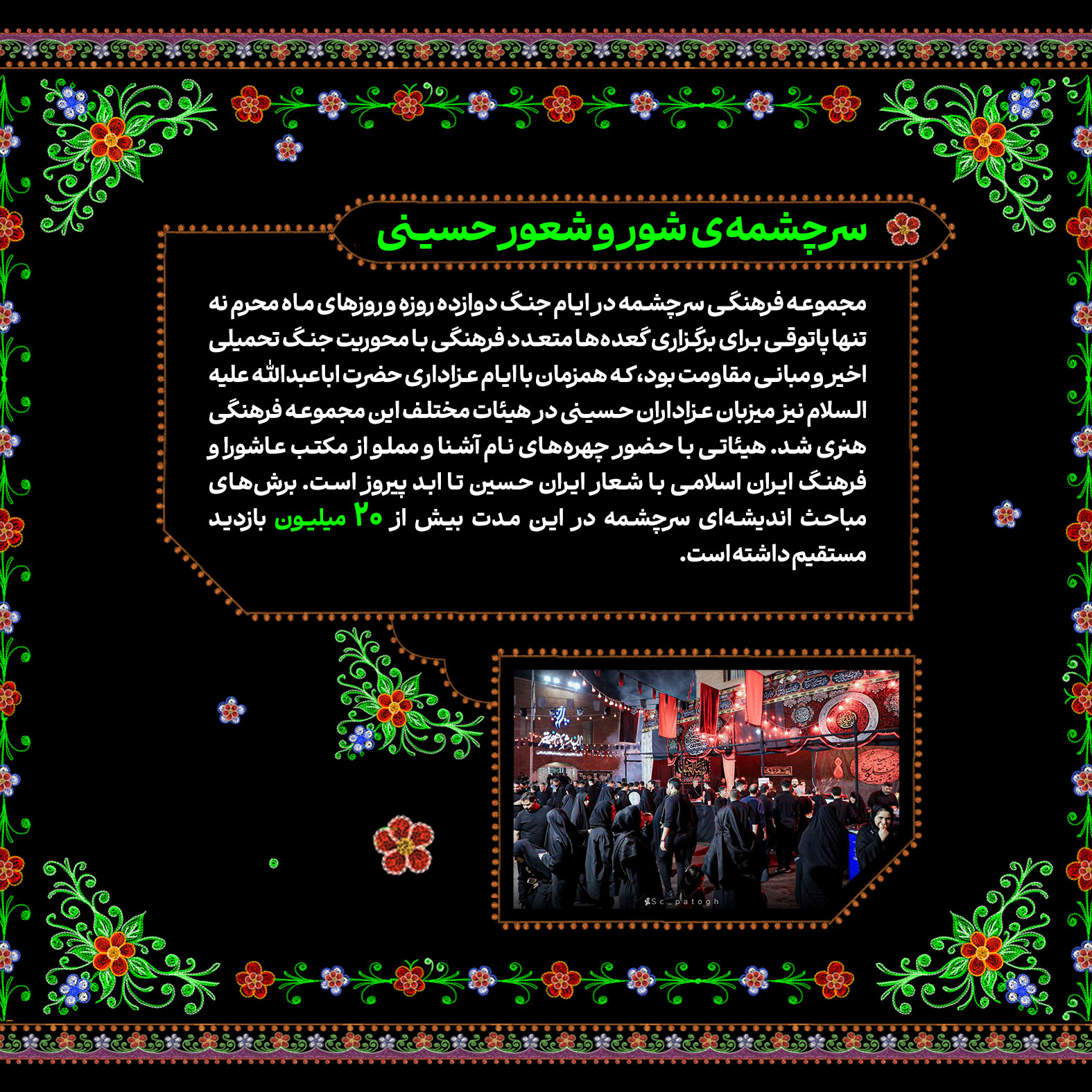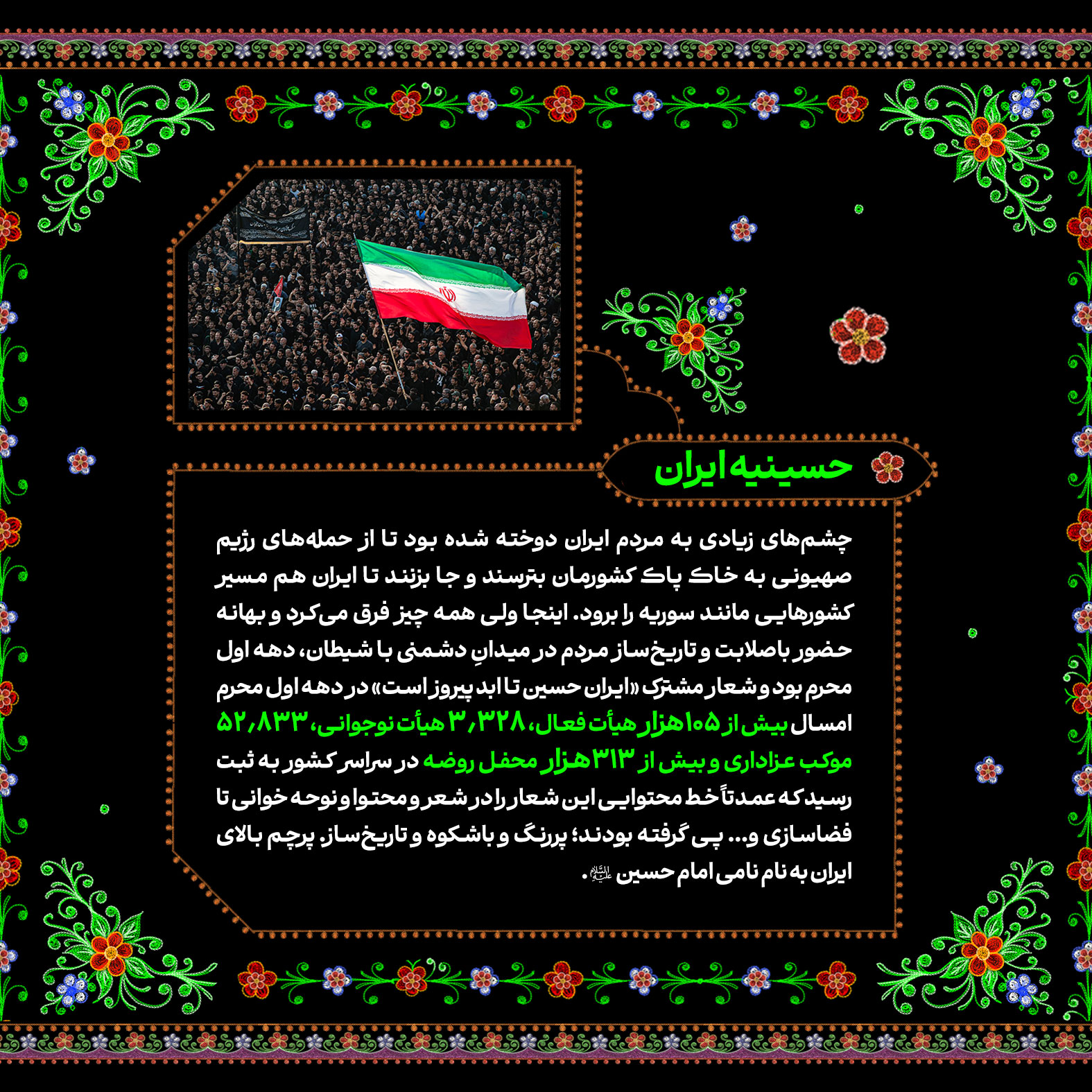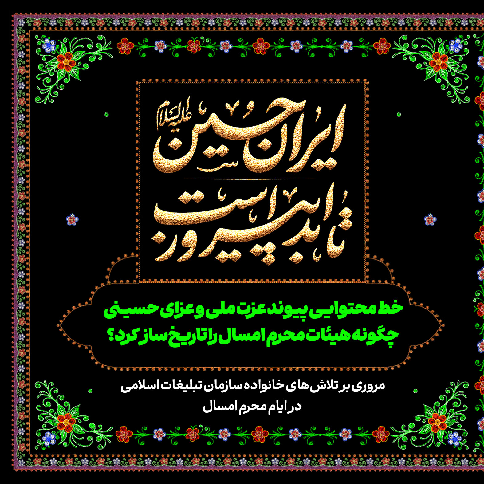 تاریخ‌سازی مردم ایران در ماه محرم امسال تماشایی و پر افتخار بود. مسیری که در روز عید غدیر و درست ساعاتی پس از حمله رژیم صهیونیستی به خاک کشورمان با حضور قاطعانه و ۱۴ میلیونی در راهپیمایی ایران ذوالفقار علی در سراسر کشور آغاز شد و با برگزاری پرشور هیئات محرمی به اوج رسید؛ پیوندی از آیین ایرانی و مکتب حسینی با شعار «ایران حسین تا ابد پیروز است». در این شماره از نشریه دیجیتال مروری کرده‌ایم بر تلاش‌های خانواده سازمان تبلیغات اسلامی در ماه محرم امسال.