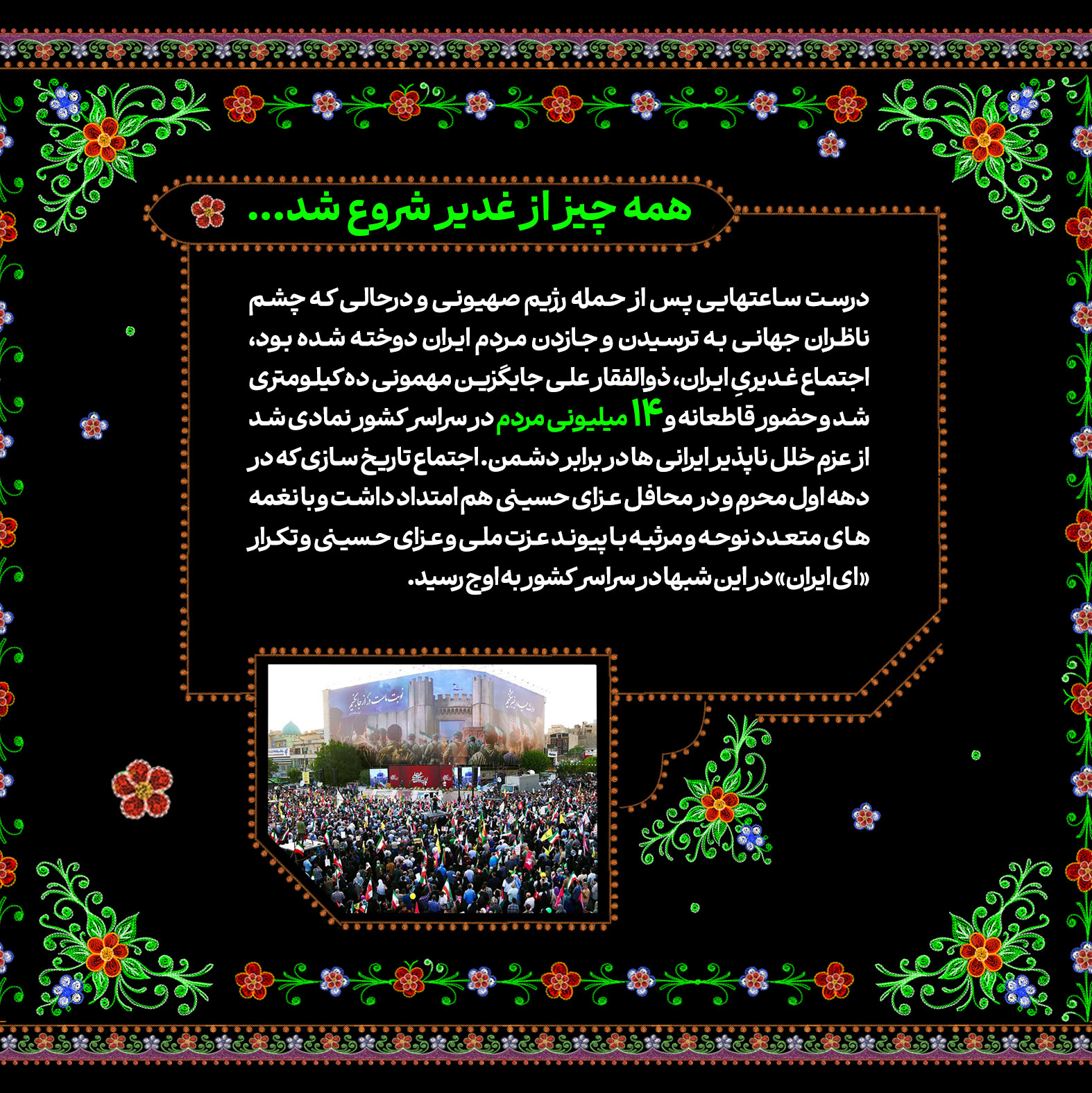 به گزارش روابط عمومی سازمان تبلیغات اسلامی، چشم‌های زیادی به مردم ایران دوخته شده بود تا از حمله به خاک کشورشان بترسند و جا بزنند؛ اما اینجا همه‌چیز فرق می‌کرد. درست ساعت‌هایی پس از حمله رژیم صهیونیستی اجتماع غدیری ایران ذوالفقار علی با حضور قاطعانه و ۱۴ میلیونی مردم در سراسر کشور تاریخ‌ساز شد و امداد این مسیر به هیئات پرشور محرم حماسی امسال رسید. بله، این‌جا ایران است، خیمه‌گاه حسین‌بن‌علی‌. ️خط محتوایی پیوند عزت ملی و عزای حسینی چگونه هیئات محرم امسال را تاریخ‌ساز کرد؟ این شماره از نشریه دیجیتال را بخوانید.