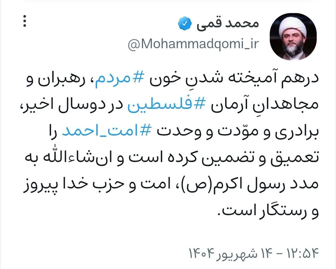 به گزارش روابط عمومی سازمان تبلیغات اسلامی، حجت‌الاسلام محمد قمی، رئیس سازمان تبلیغات اسلامی به مناسبت هفته وحدت در صفحه شخصی خود در شبکه اجتماعی ویراستی نوشت؛