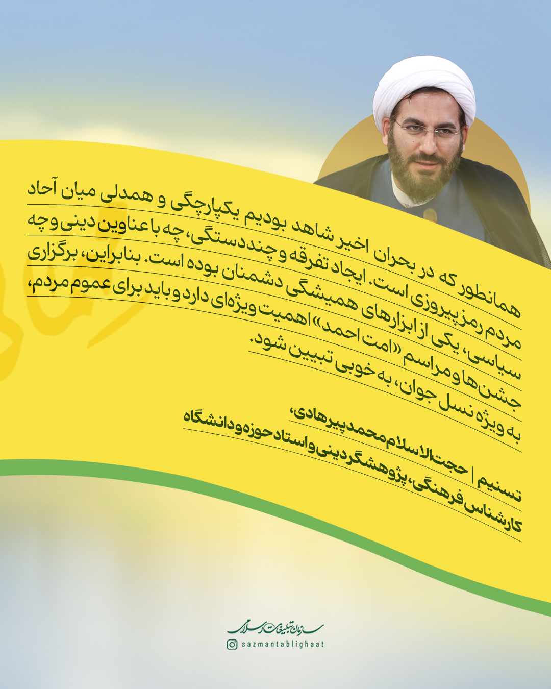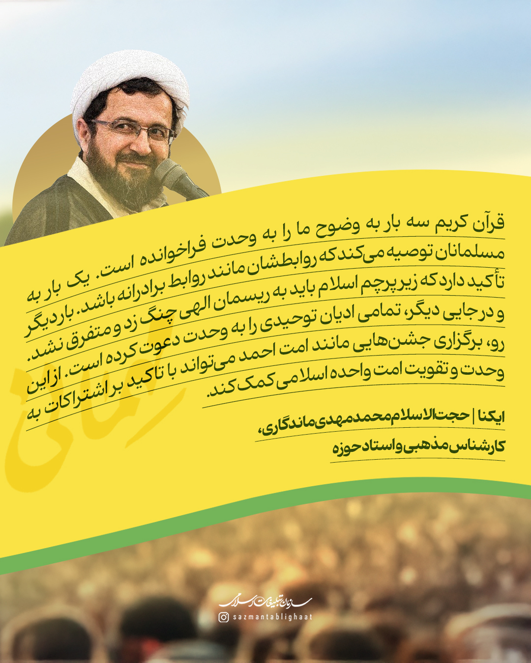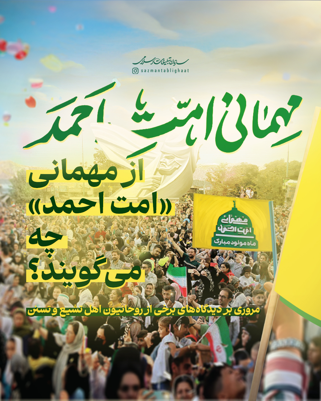 به گزارش روابط عمومی سازمان تبلیغات اسلامی، مهمانی امت احمد و جشن مردمی میلاد پیامبر اکرم سه سال پیش در سنندج آغاز شد و امسال، همزمان با هزار و پانصدمین سال میلاد پیامبر مهربانی‌ها به استان‌های مختلف کشور رسید. این‌بار جز کردستان، بیش از 8 استان کشور، از سیستان و بلوچستان و بندرعباس تا قم و تهران و گلستان میزبان جشن‌های بزرگ مردمی امت احمد در هفته وحدت بودند. جشن‌هایی که نه تنها رنگ و بوی شادی داشتند، بلکه پیام‌آور هم‌بستگی و وحدت ملی مردم ایران اسلامی شدند. به همین مناسبت نظر برخی از روحانیون شیعه و اهل سنت را در خصوص مهمانی امت احمد مرور می‌کنیم.