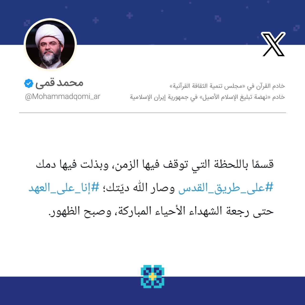 همچنین  حجت‌الاسلام قمی همین متن را به زبانی عربی در شبکه اجتماعی ایکس نیز منتشر کرد.