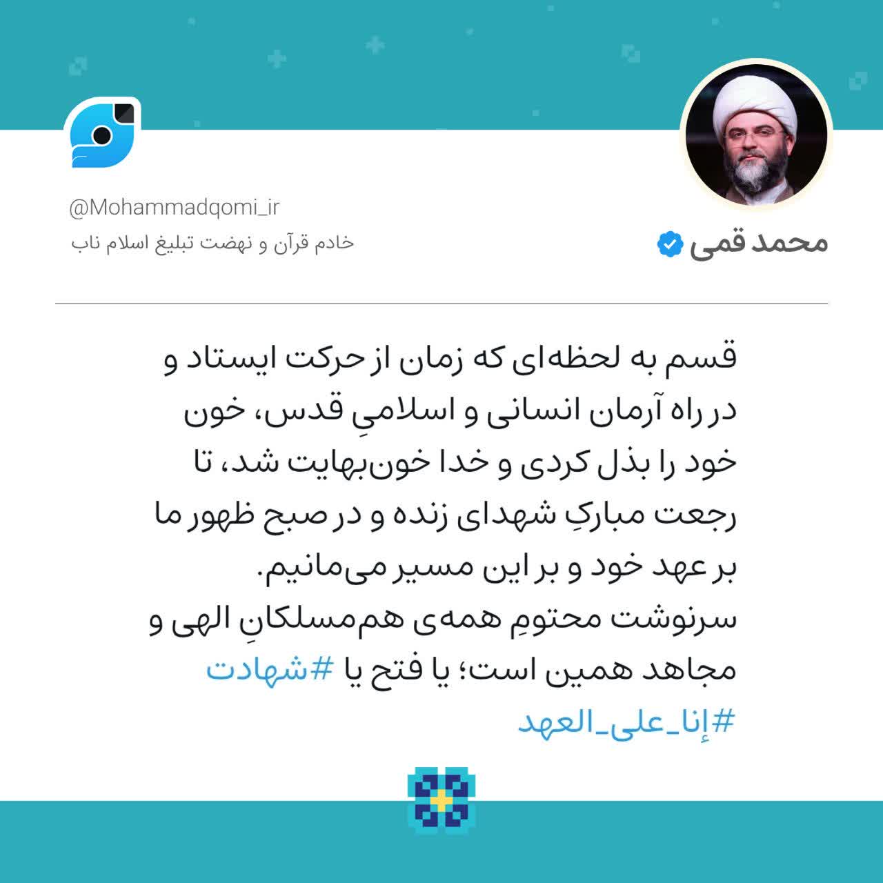 قسم به لحظه‌ای که زمان از حرکت ایستاد و در راه آرمان انسانی و اسلامیِ قدس، خون خود را بذل کردی و خدا خون‌بهایت شد، تا رجعت مبارکِ شهدای زنده و در صبح ظهور ما بر عهد خود و بر این مسیر می‌مانیم. سرنوشت محتومِ همه‌ی هم‌مسلکانِ الهی و مجاهد همین است؛ یا فتح یا شهادت.
