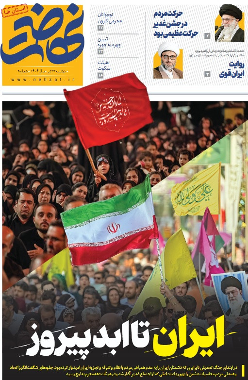ایران تا ابد پیروز درست توی ساعت‌هایی که دشمنان ایران با خیال خام ترسیدن ایرانی‌ها از حملات سبعانه صهیونیست‌ها خوشحال بودند، ایرانی‌ها به خیابان آمدند تا عید غدیر را به اجتماع باشکوه ایران ذوالفقار علی گره بزنند تا همه‌ی دشمنان دوباره از این ملت باشکوه و غیور تو دهنی بخورند؛ مسیر تاریخ‌سازی که از غدیر شروع شد و در دهه محرم ادامه یافت تا تصویر نمادین پرچم ایران و پرچم عزای حسینی با حمایت تاریخی این مردم نازنین، ایران را تا همیشه بیمه کند. ویژه‌نامه نهضت استان‌ها سفری کرده به روزهای تاریخی غدیر تا عاشورا در ایران؛ روزهایی که تاریخ از آن‌ها با شکوه و احترام یاد خواهد کرد.