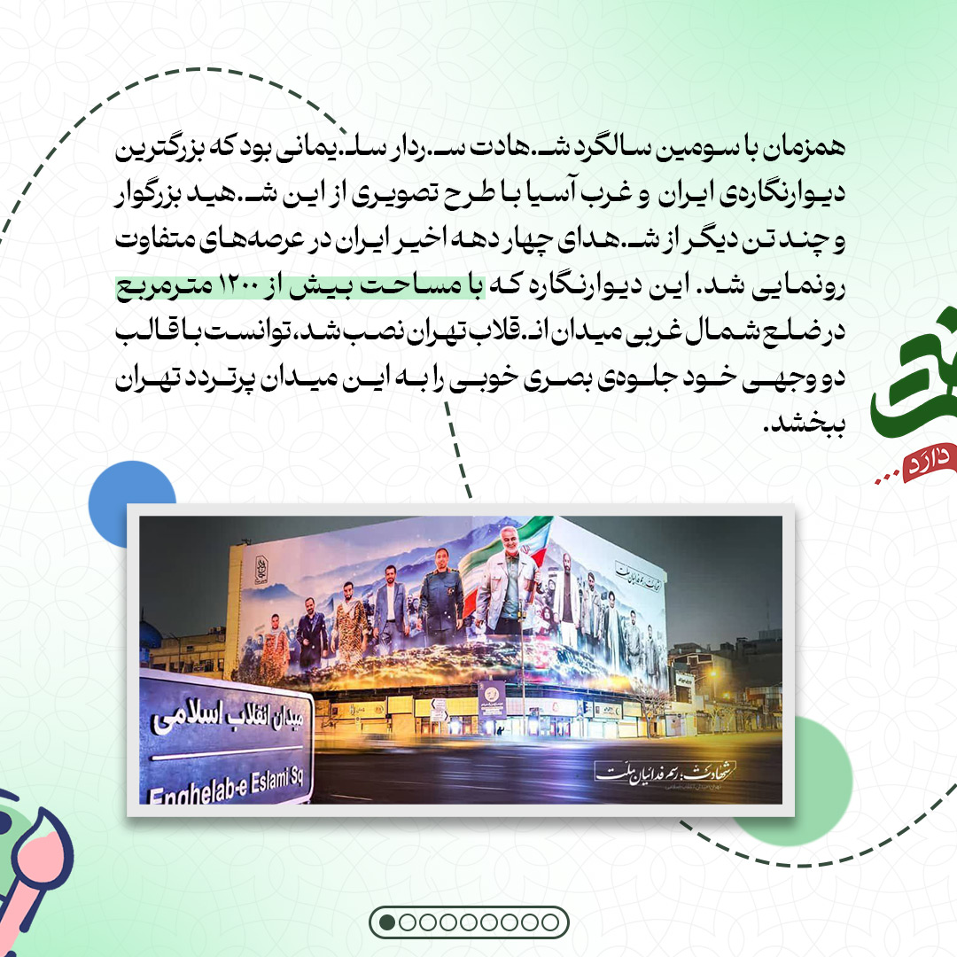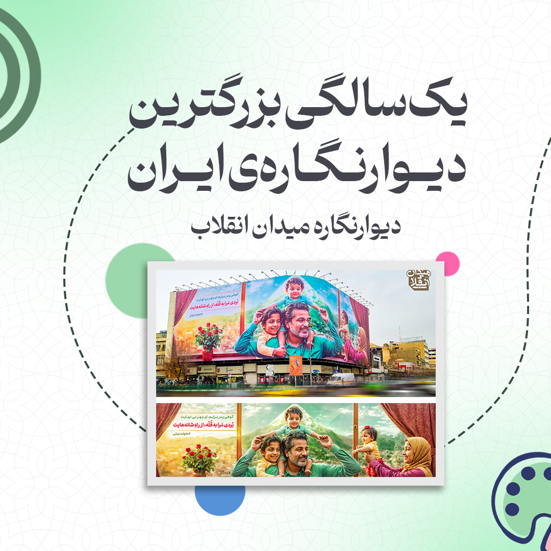 به گزارش روابط عمومی سازمان تبلیغات اسلامی، در روزهای اخیر طرح تازهی دیوارنگارهی میدان انقلاب تهران همزمان با میلاد باسعادت حضرت علی(ع) و روز پدر رونمایی شد. به مناسبت اکران نخستین طرح این دیوارنگاره در سال جدید فعالیت آن، در این شماره از نشریه دیجیتال نگاهی میاندازیم به بزرگترین دیوارنگارهی ایران و برخی از طرحهای آن در یکسال گذشته را با یکدیگر مرور میکنیم.