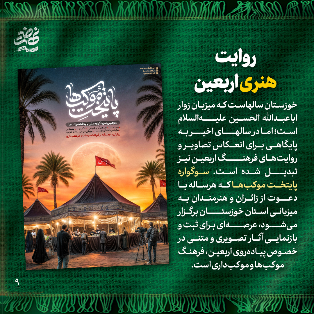 به گزارش روابط عمومی سازمان تبلیغات اسلامی، به بهانهی اربعین حسینی و اجتماع باشکوه عاشقان حضرت ثارالله در طریق الحسین، در این شماره از نشریه دیجیتال مروری میکنیم بر برخی از آثار و تلاشهای خانوادهی سازمان تبلیغات اسلامی که هریک عرض ارادتی است به ساحت والای حضرت اباعبدالله الحسین علیهالسلام به زبان هنر و رسانه. مهمانید به تماشا.
