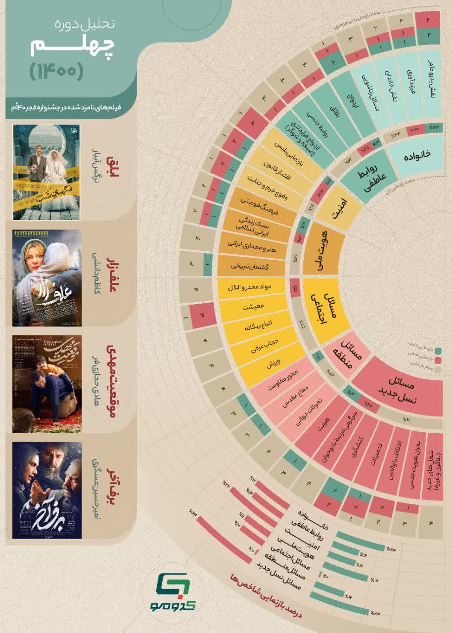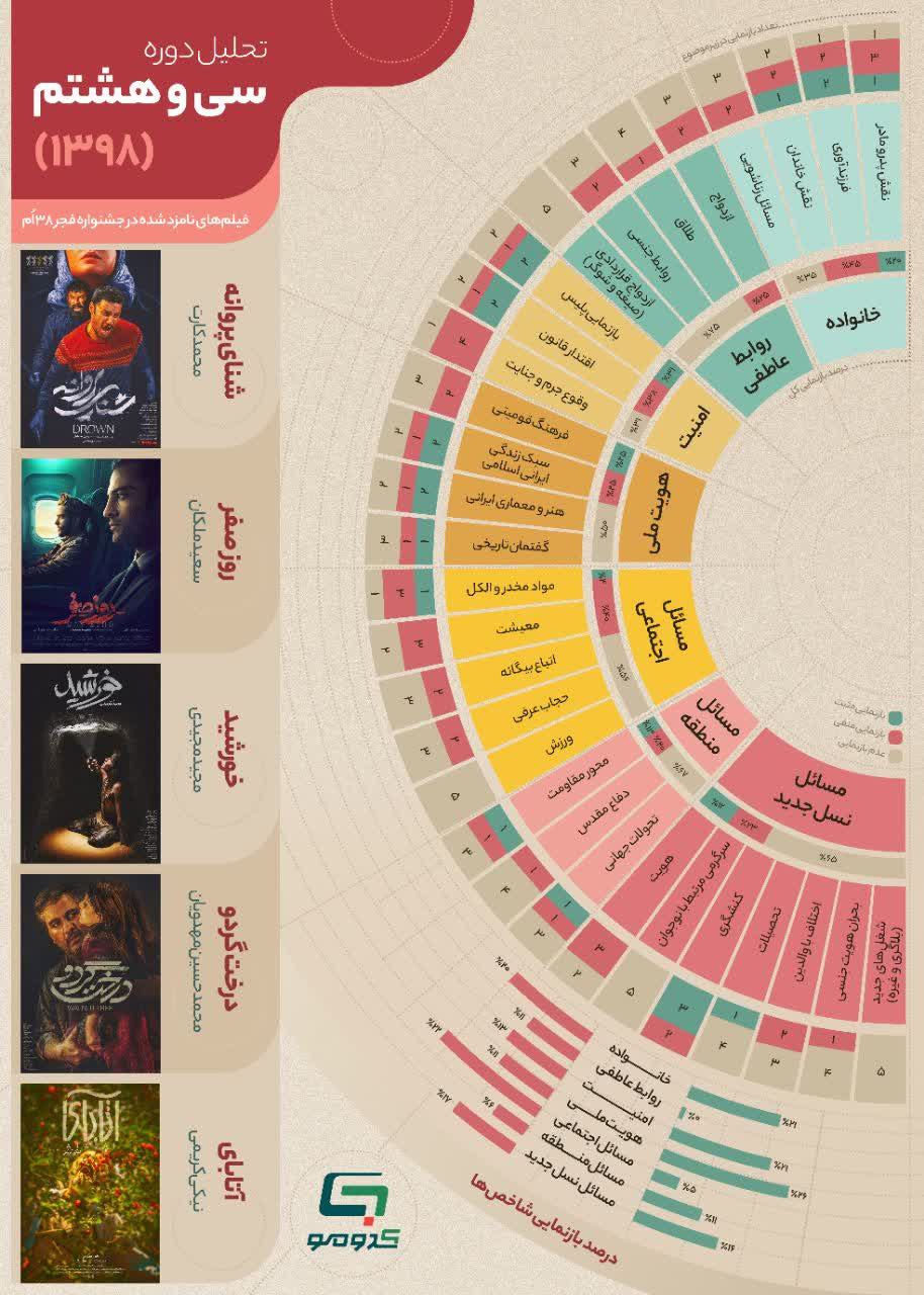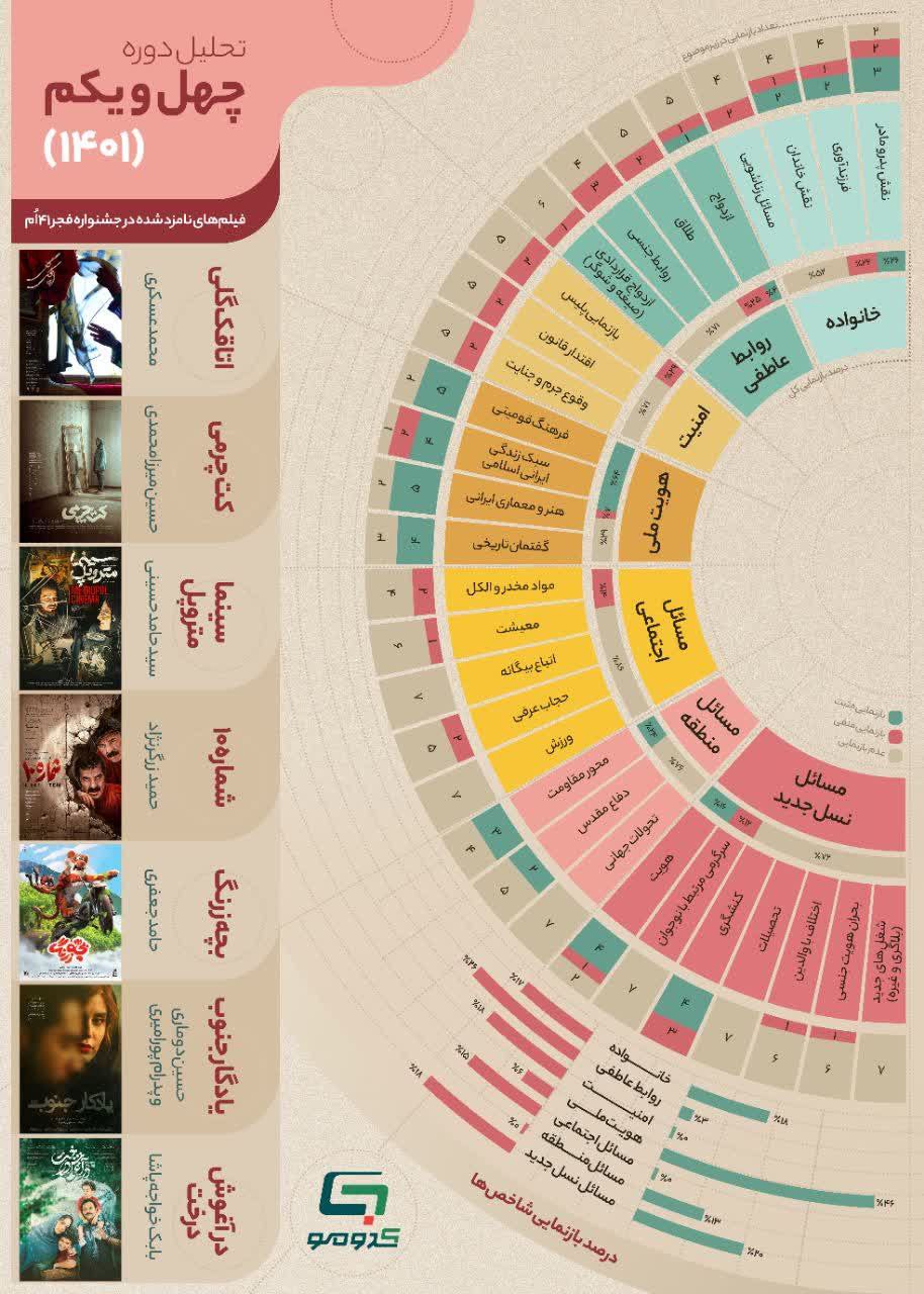 به گزارش روابط عمومی سازمان تبلیغات اسلامی، اینفوگرافی تحلیلی از موضوعات به کار رفته در فیلمهای منتخب 6 دوره اخیر جشنواره فجر با در نظر گرفتن پارامترهای تربیتی و ارزیابی موثر در ردهبندی سنی توسط کدومو.