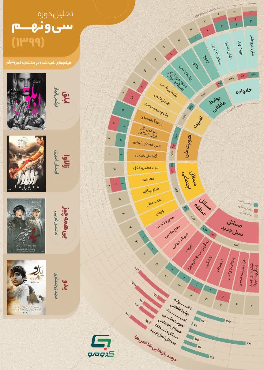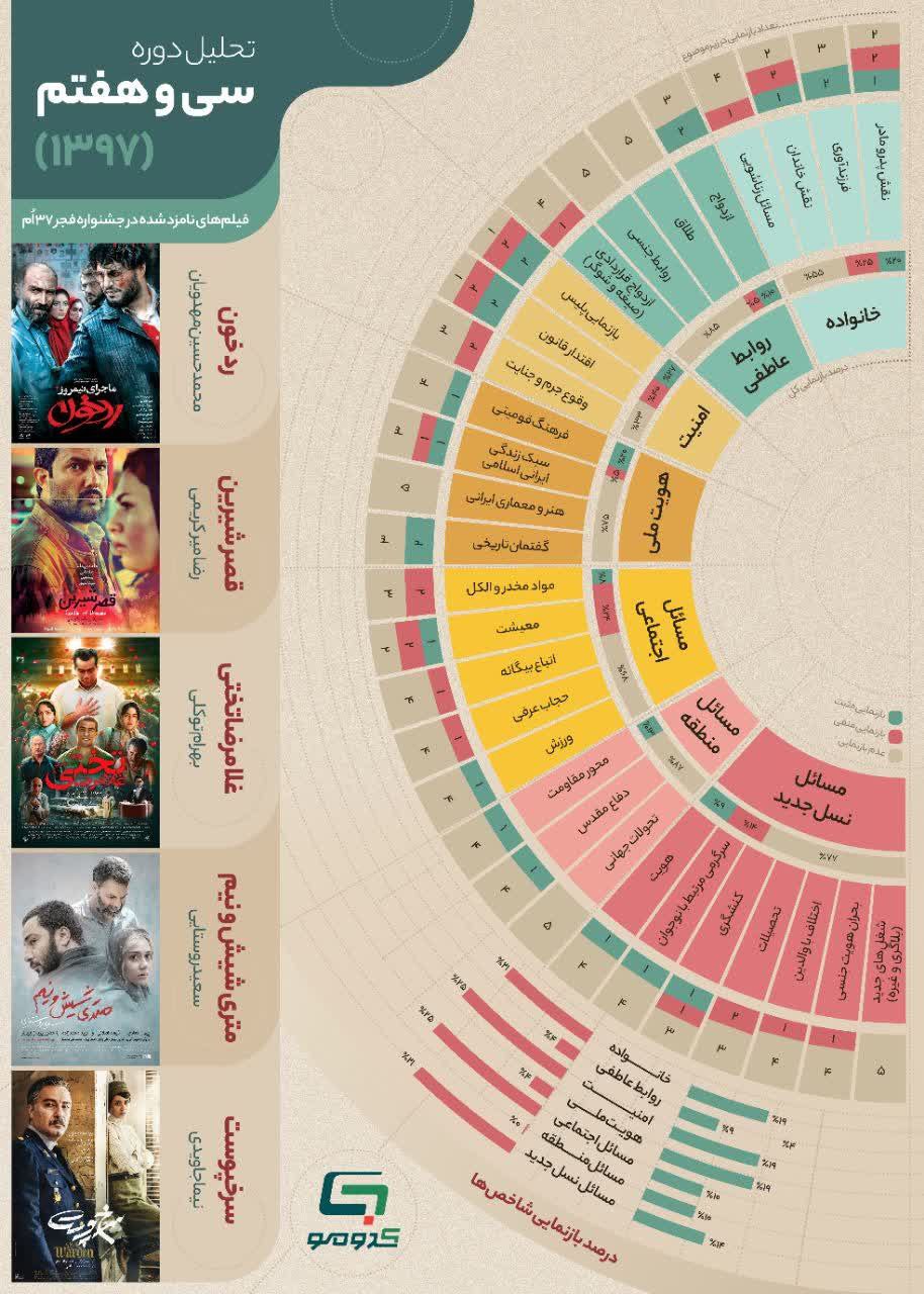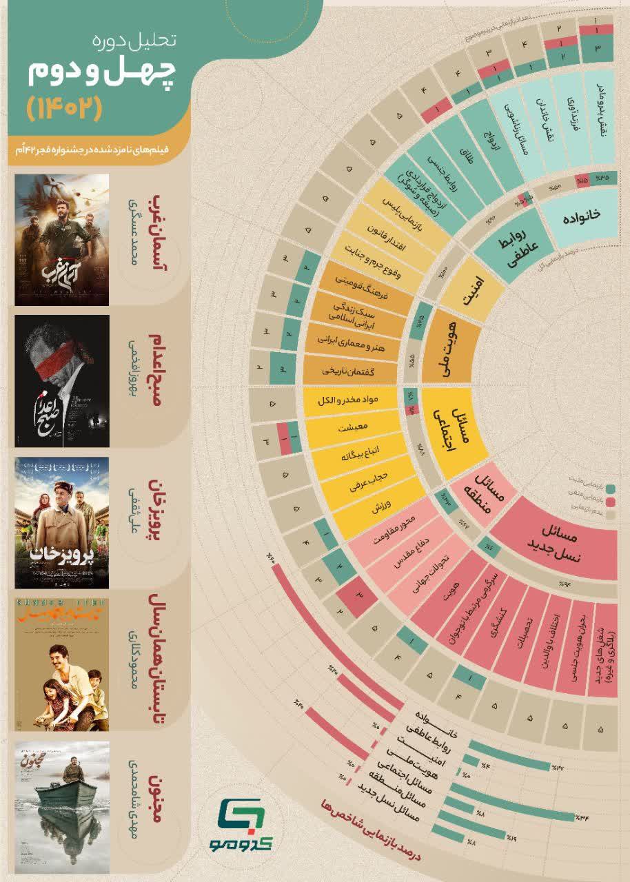 به گزارش روابط عمومی سازمان تبلیغات اسلامی، اینفوگرافی تحلیلی از موضوعات به کار رفته در فیلمهای منتخب 6 دوره اخیر جشنواره فجر با در نظر گرفتن پارامترهای تربیتی و ارزیابی موثر در ردهبندی سنی توسط کدومو.