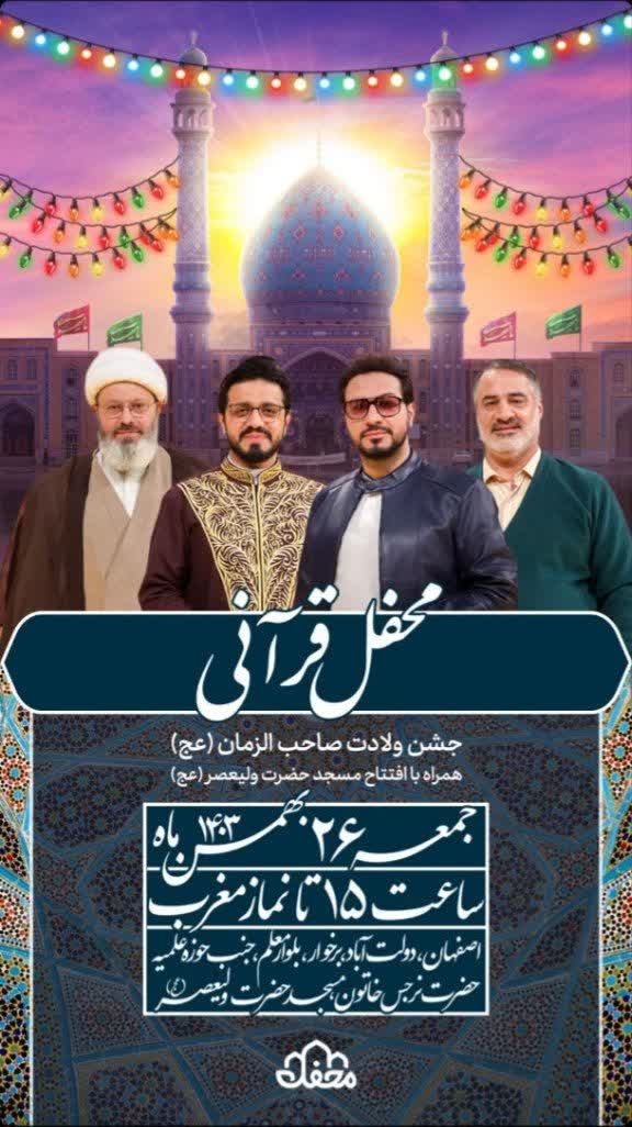 به مناسبت میلاد با سعادت حضرت ولی عصر (عج) محفل قرآنی امام زمانیها با حضور میزبانان برنامه محفل در مسجد حضرت ولیعصر(عج) اصفهان برگزار میشود.