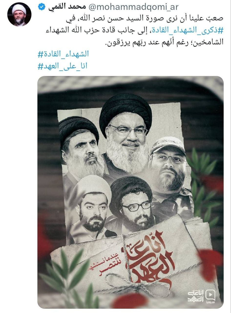 به گزارش روابط عمومی سازمان تبلیغات اسلامی، حجتالاسلام محمد قمی، رئیس سازمان تبلیغات اسلامی همزمان با سخنرانی شیخ نعیم قاسم، دبیرکل حزبالله لبنان به مناسبت «روز بزرگداشت رهبران شهید مقاومت»، با انتشار توییتی به زبان عربی در صفحهی شخصی خود در شبکهی اجتماعی X با گرامیداشت مقام والای شهید سیدحسن نصرالله، قرار گرفتن نام و تصویر این رهبر شجاع در کنار فرماندهان و رهبران شهید مقاومت را سخت و جانکاه توصیف کرد.