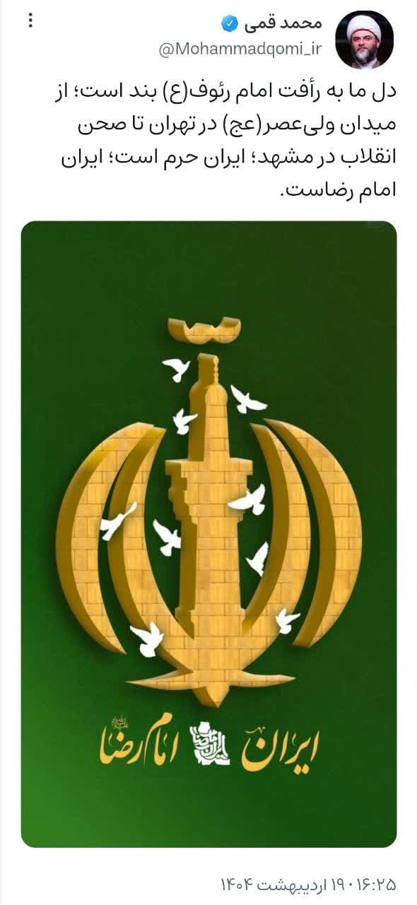 به گزارش روابط عمومی سازمان تبلیغات اسلامی، حجتالاسلام محمد قمی، رئیس سازمان تبلیغات اسلامی به مناسب ولادت امام رضا (ع) در صفحه شخصی خود در شبکه ویراستی نوشت؛ از میدان ولیعصر(عج) در تهران تا صحن انقلاب در مشهد؛ ایران حرم است،ایران امام رضاست.