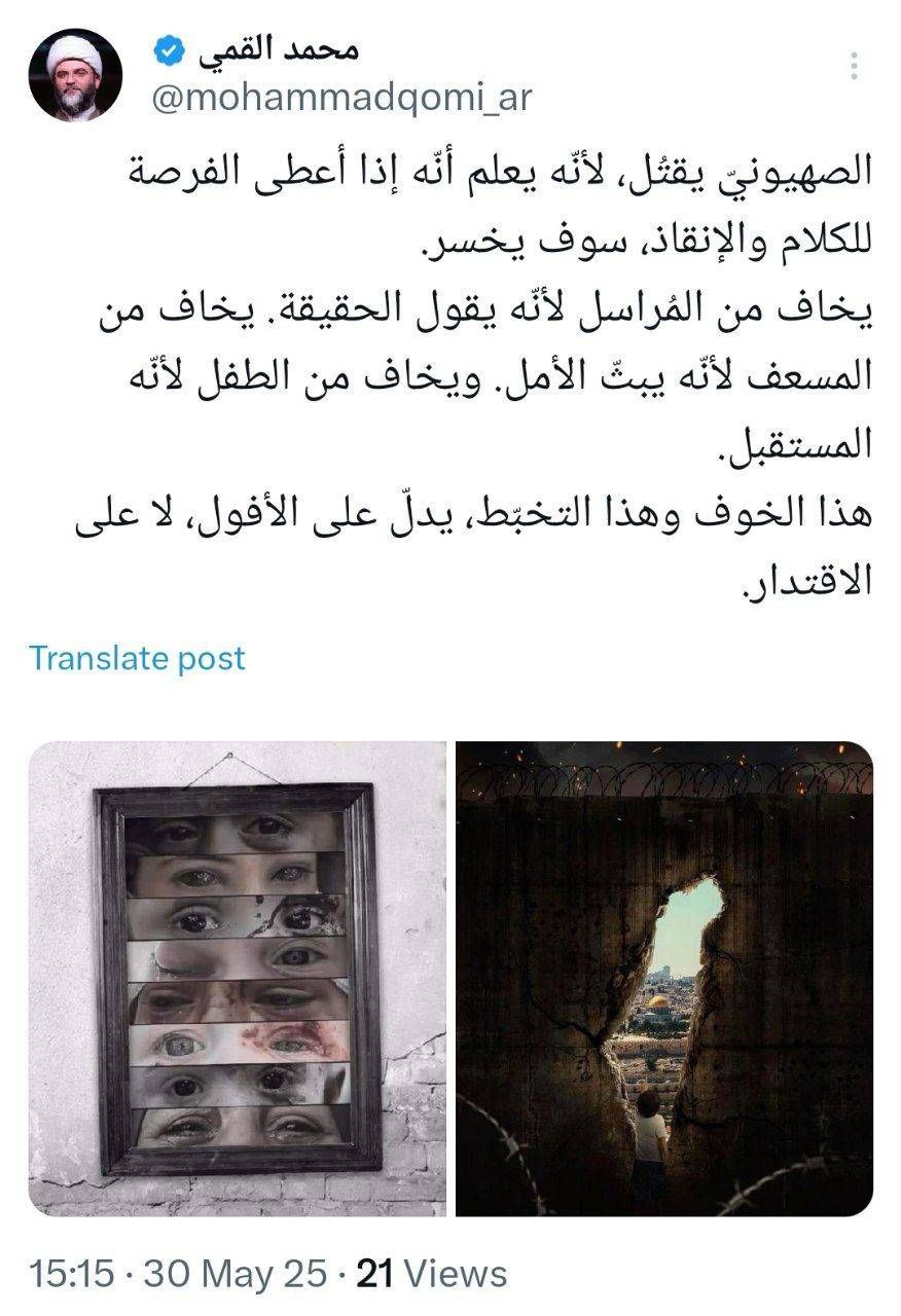 به گزارش روابط عمومی سازمان تبلیغات اسلامی، حجتالاسلام محمد قمی، رئیس سازمان تبلیغات اسلامی در صفحه شخصی خود در شبکه ایکس به زبان عربی برای مخاطبین عرب زبان نوشت؛ صهیونیست میکُشد، چون میداند اگر فرصتِ روایت و نجات بدهد، میبازد. از خبرنگار میترسد چون حقیقت را میگوید؛ از امدادگر چون امید میآورد؛ از کودک چون آینده است. این ترس، نشانه افول است، نه اقتدار.