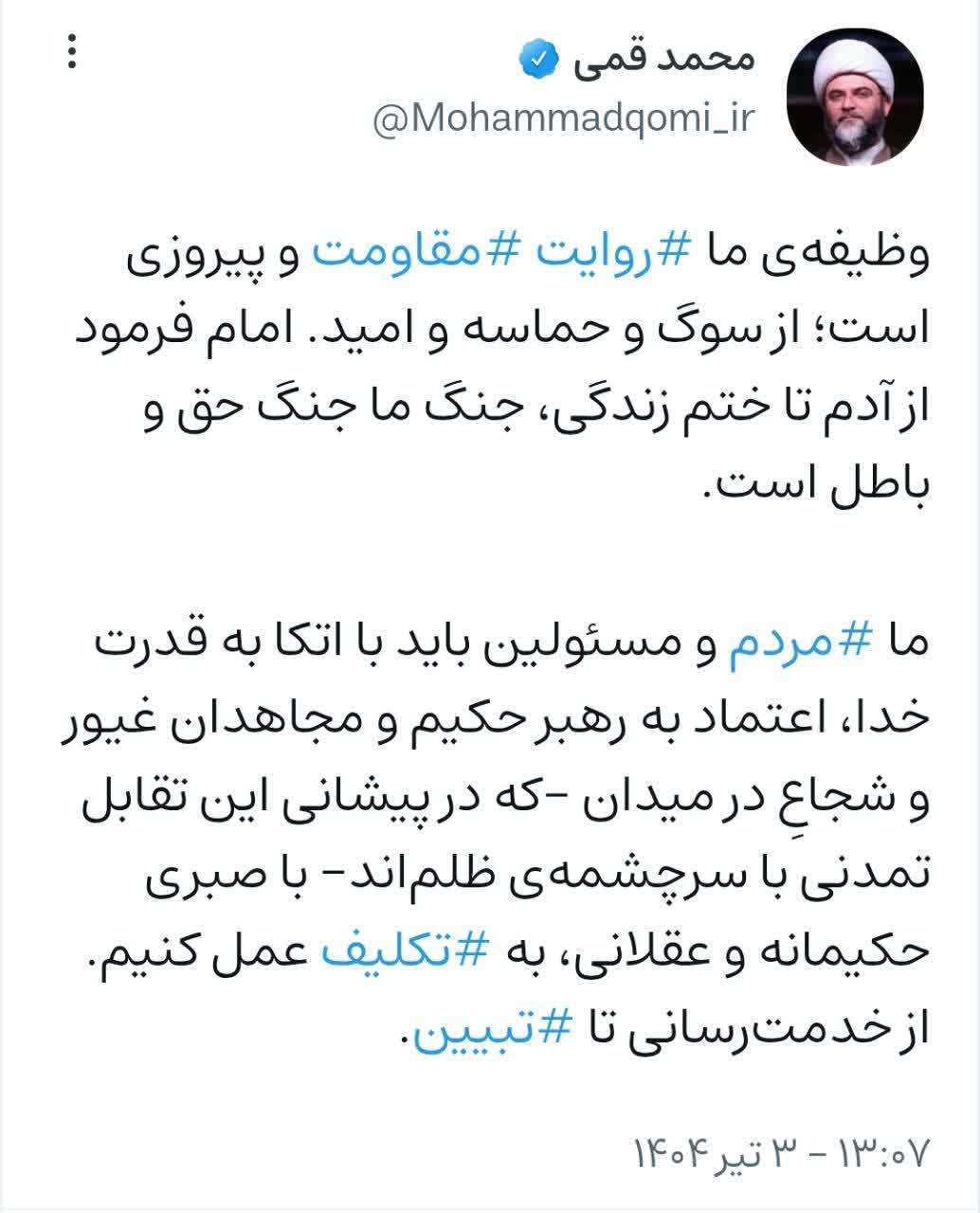 ۳ تیر | حجتالاسلام قمی در صفحه شخصی خود نوشت؛