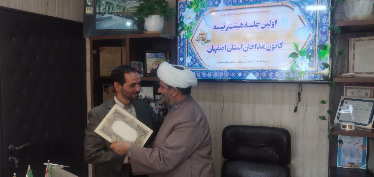 درپایان این جلسه احکام اعضای هیئت رئیسه کانون مداحان استان اصفهان توسط حجه الاسلام و المسملین فوقی به آنها اهداء گردید .